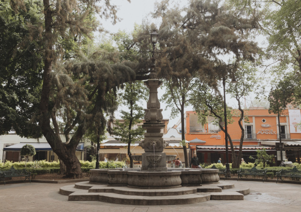 El arbolado parque Jardín Centenario se encuentra en el centro del bohemio Coyoacán, conocido por sus calles adoquinadas y su arquitectura colonial.